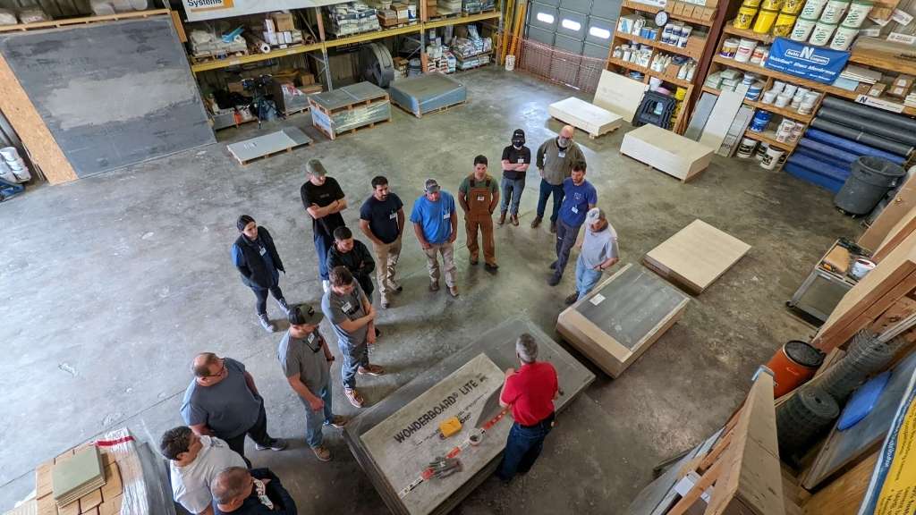 - Attendees work in actual room size modules installing tile.